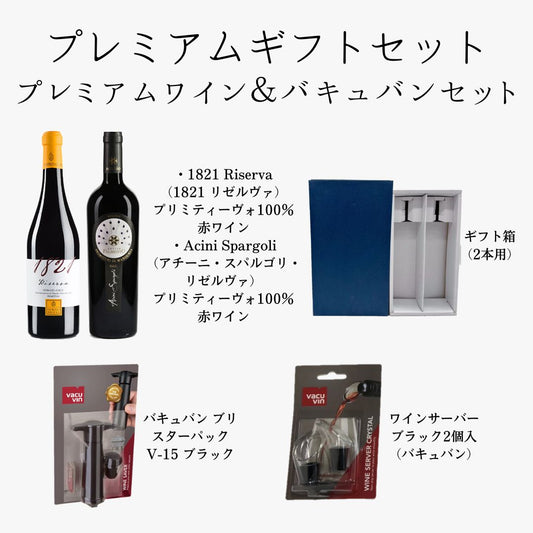 【ギフトセット】極上プリミティーヴォ 1821リゼルヴァ & アチーニ・スパルゴリ・リゼルヴァ with バキュバンセット 送料無料!