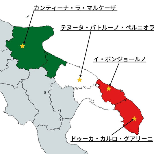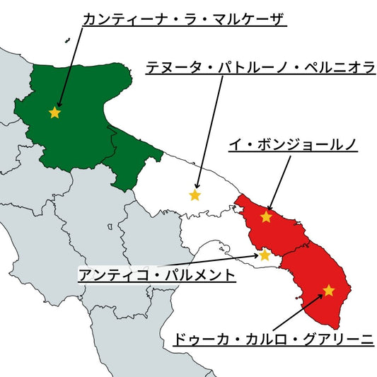 現在当ショップで取り扱っている、こだわりの高品質ワインを造る小規模生産者はTenuta Patruno Perniola (テヌータ・パトルーノ・ペルニオラ)、I Buongiorno(イ・ボンジョールノ) 、Duca Carlo Guarini(ドゥーカ・カルロ・グアリーニ)、Cantina La Marchesa(カンティーナ・ラ・マルケーザ)、Antico Palmento(アンティコ・パルメント)、Castello Frisari(カステッロ・フリザーリ)の6ワイナリーです。