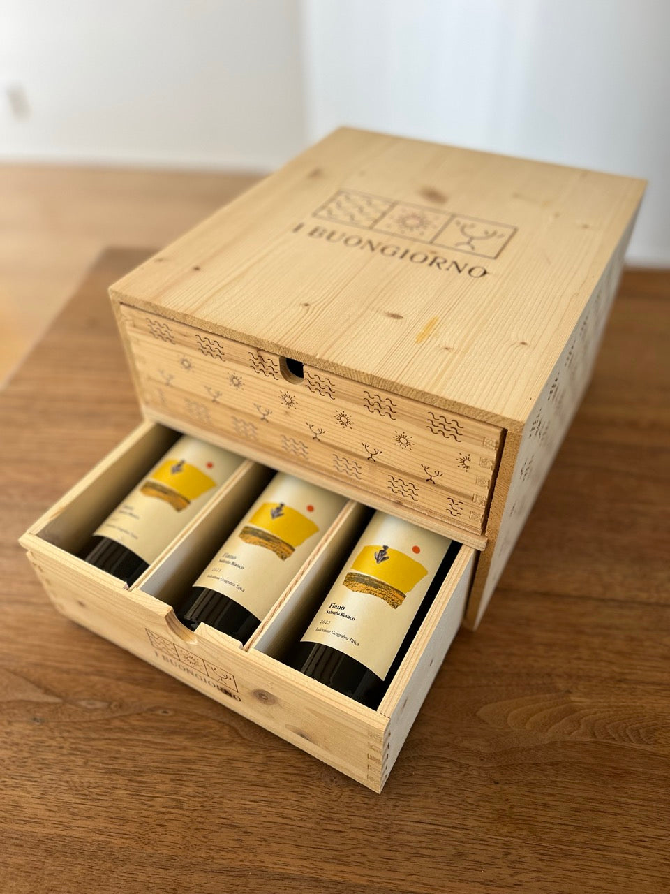 プーリア州のマイクロワイナリーの一つ「I Buongiorno」 のフィアーノ6本ワインに、ワイナリー限定のオリジナル木箱も付いてくる豪華セットです。オリジナル木箱には2段の引き出しが付いており、上下3本ずつワインが収納できます。